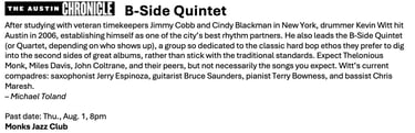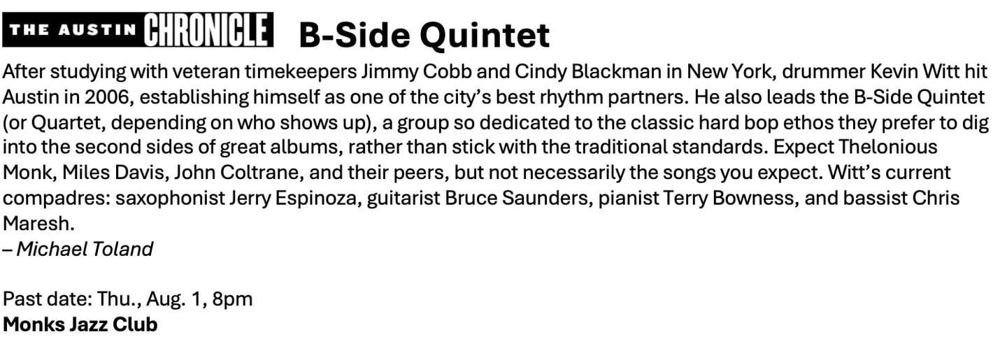 That night, b-side reminded Austin that jazz is not background music, nor nostalgia, nor a museum piece. It is alive, shifting, resisting definition — hopeful, elusive, and always ready to surprise.